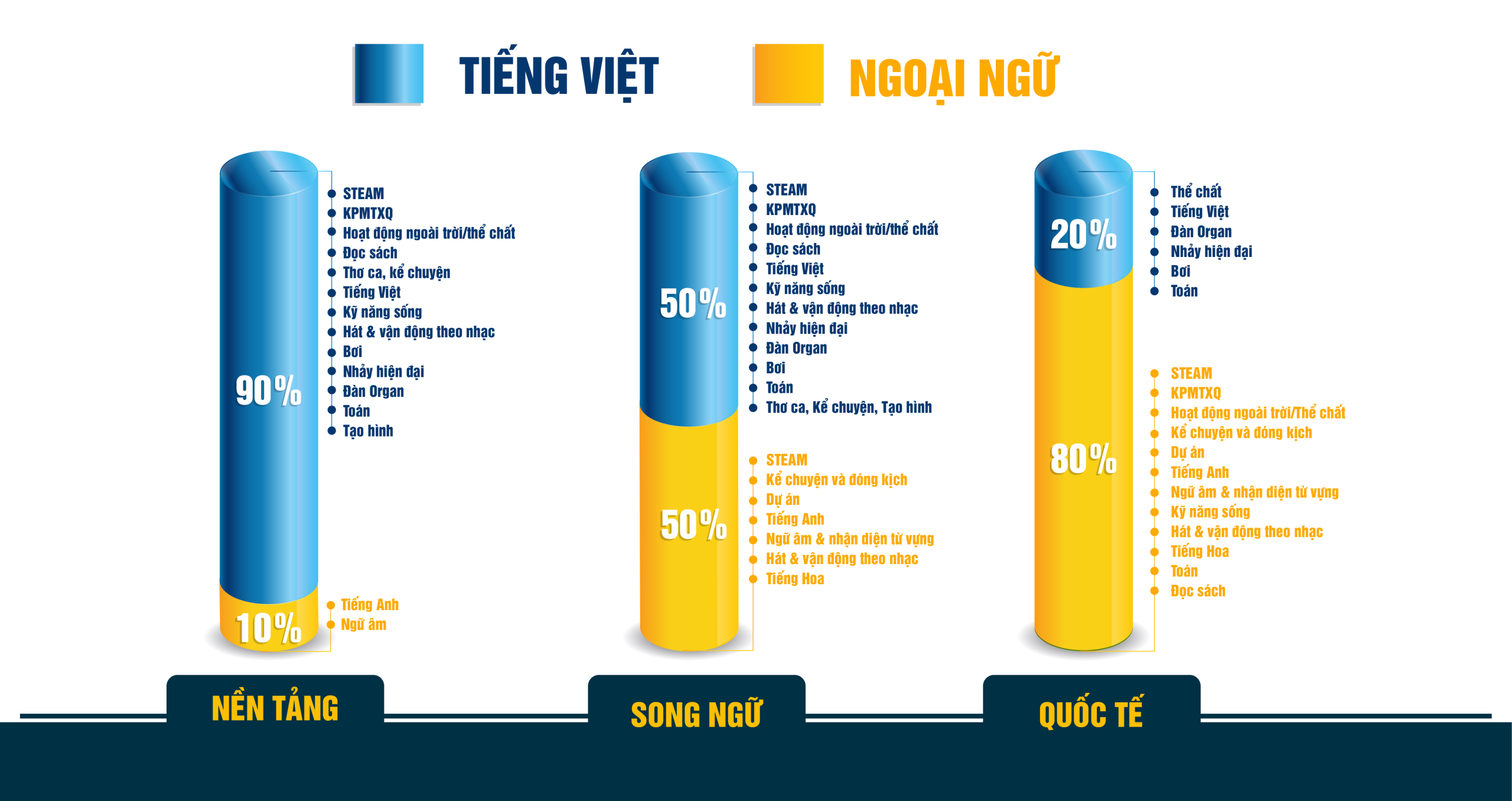 Với chương trình học Nền tảng, Song ngữ và Quốc tế với điểm khác biệt căn bản, INschool chúng tôi thể hiện một cách đơn giản thông qua biểu đồ dưới đây: