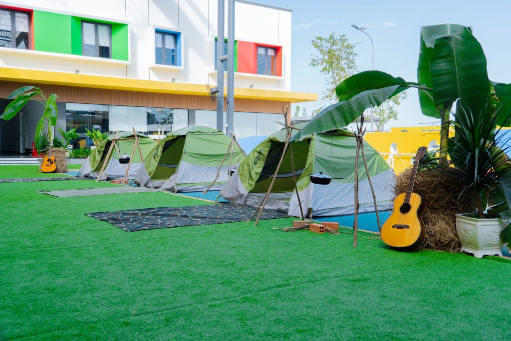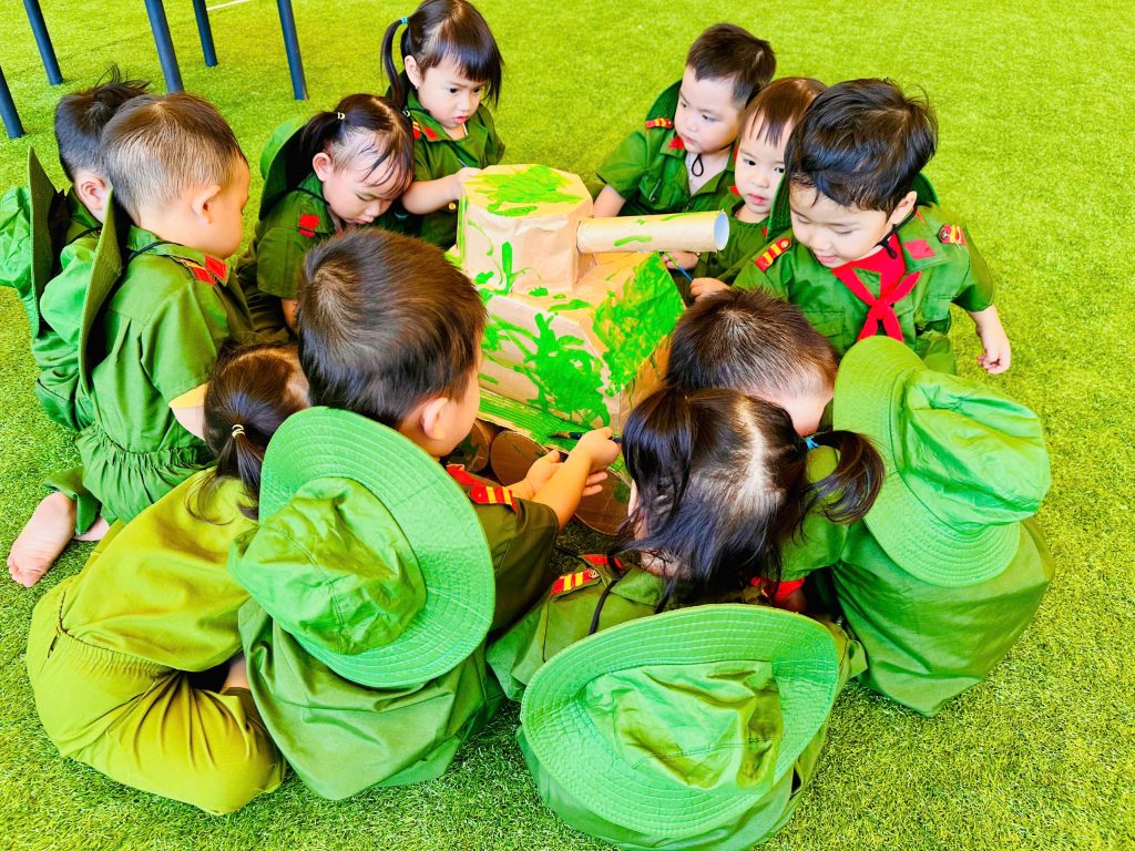- Kỹ năng dựng lều trại: Các bé được làm quen với hoạt động tập thể, học cách phối hợp đồng đội để dựng nên những “căn cứ” quân sự nhỏ xinh.