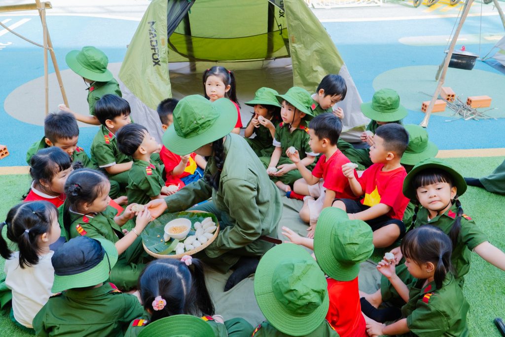 - Bữa cơm hành quân đặc biệt: Trải nghiệm món “cơm nắm muối mè” giản đơn đã giúp các con hiểu hơn về cuộc sống gian khổ nhưng hào hùng của các chú bộ đội, từ đó biết trân trọng hơn những giá trị hạnh phúc hiện tại.